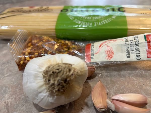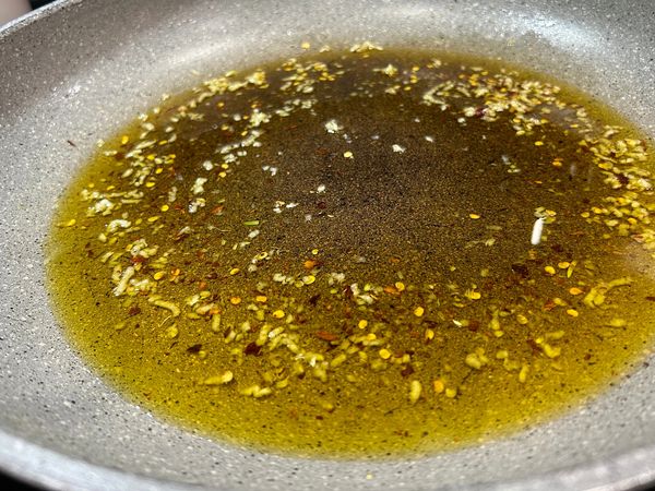 Turn the heat on medium-low to slowly extract the flavors from the garlic and red pepper